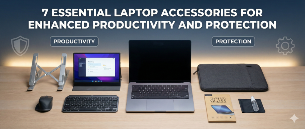 Essential laptop accessories include external monitors, ergonomic keyboards, wireless mice, laptop stands, carrying cases, portable SSDs, and USB-C hubs. These