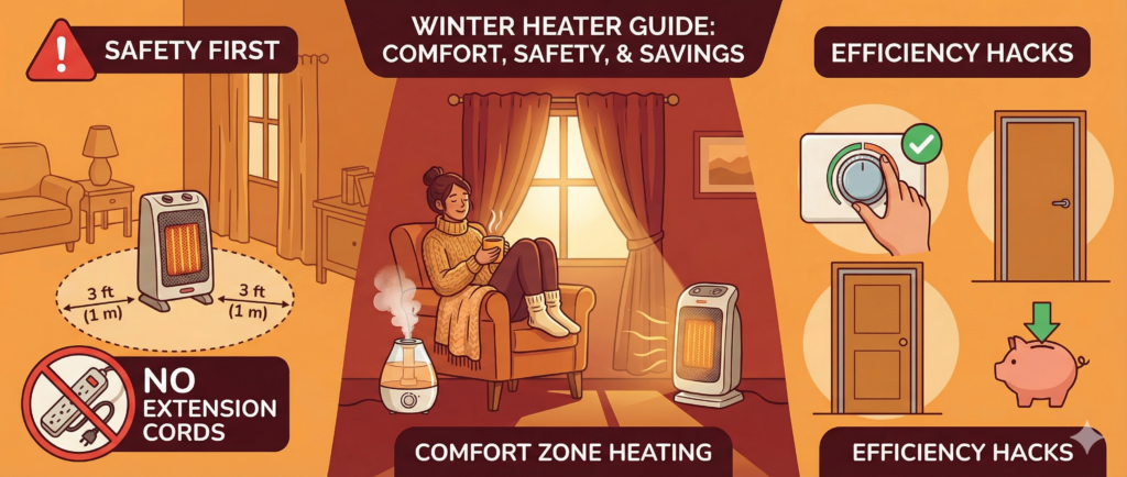 To use a room heater effectively in winter, position it on a flat, stable surface away from flammable materials. Set